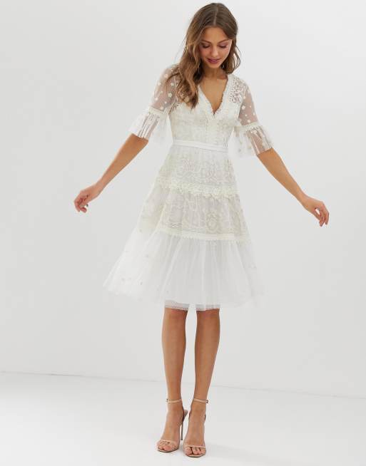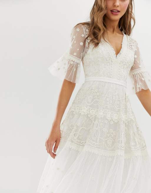 Needle & thread embroidered midi dress with flutter sleeve in ivory clearance