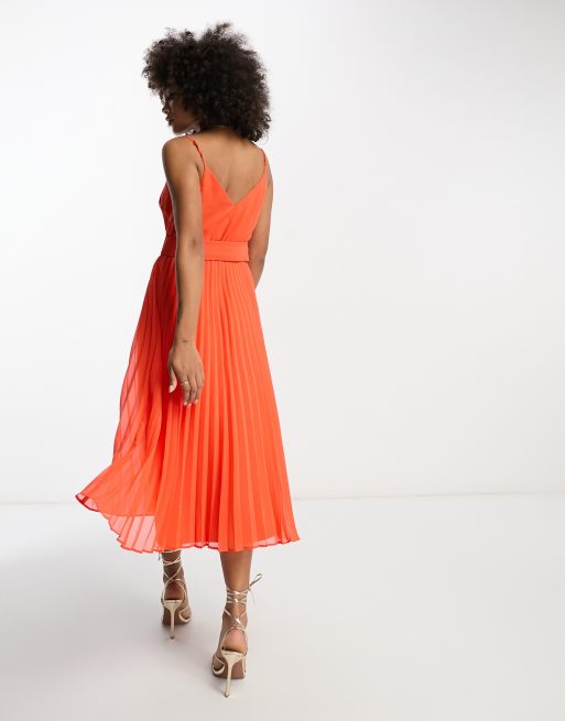 Oasis coral pleated dress clearance, ASOS DESIGN pleated cami midi dress with self covered belt in hot orange clearance
