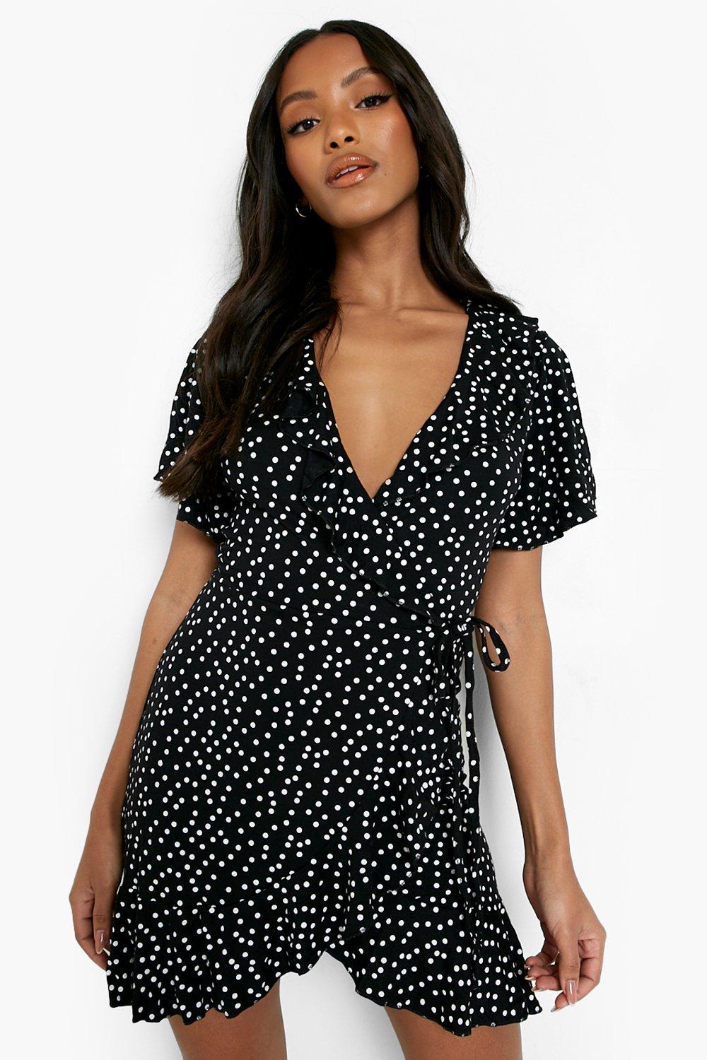 Petite Polka Dot Ruffle Wrap Tea Dress boohoo