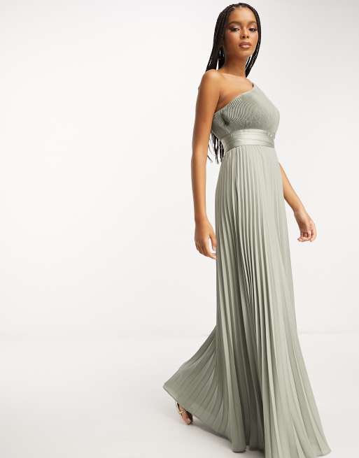 ASOS DESIGN Bridesmaid pleated one shoulder maxi dress with tie waist in sage