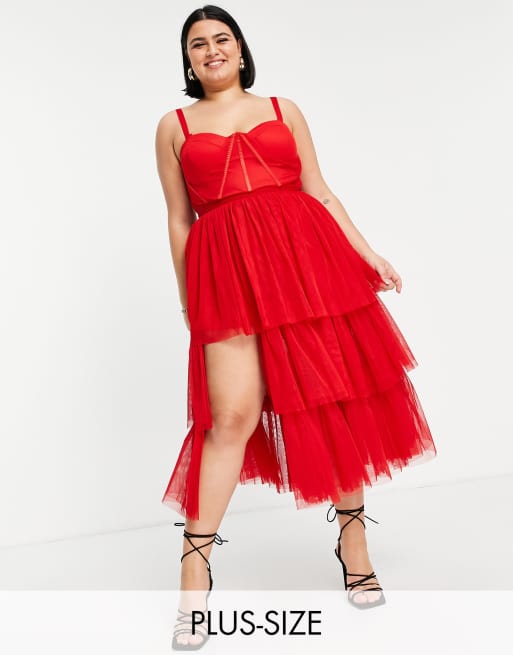 Lace Beads Plus corset tiered tulle midi dress in red ASOS