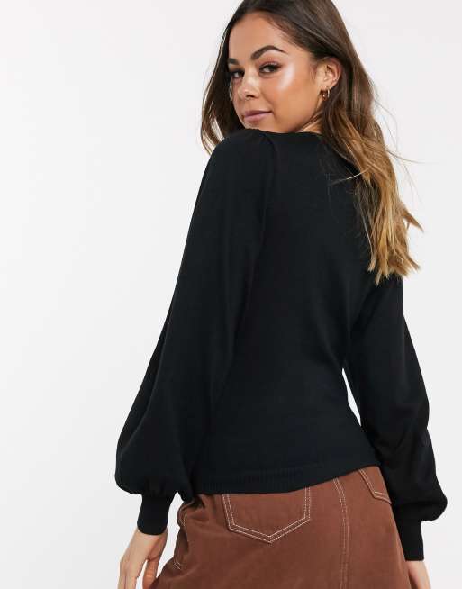 Puff sleeve black jumper clearance, QED London pearl embellished puff sleeve jumper in black clearance