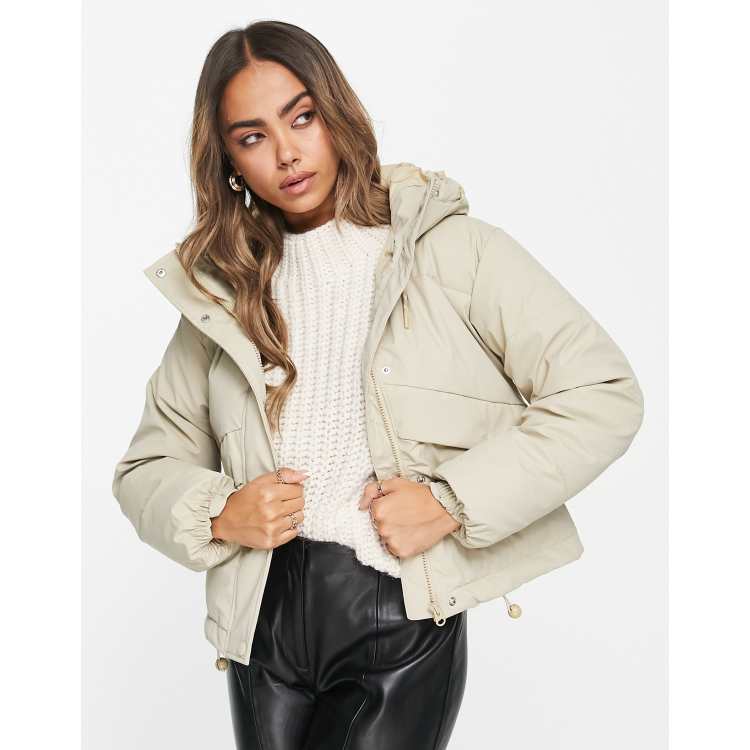 Pull Bear quilted puffer coat with hood in ecru