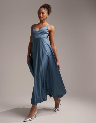 ASOS DESIGN Bridesmaid satin wrap maxi dress with tie detail in steel blue