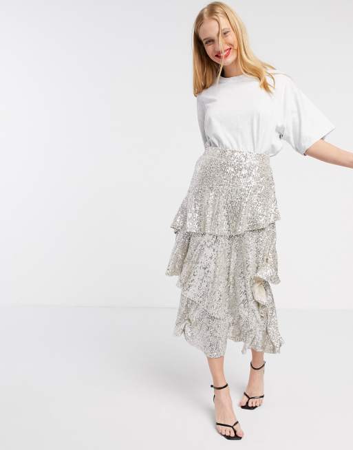 Ruffle skirt topshop clearance, Topshop sequin midi skirt in silver clearance