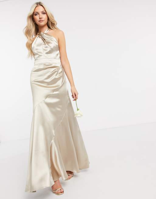 ASOS DESIGN Bridesmaid satin halter maxi dress with paneled skirt and keyhole detail