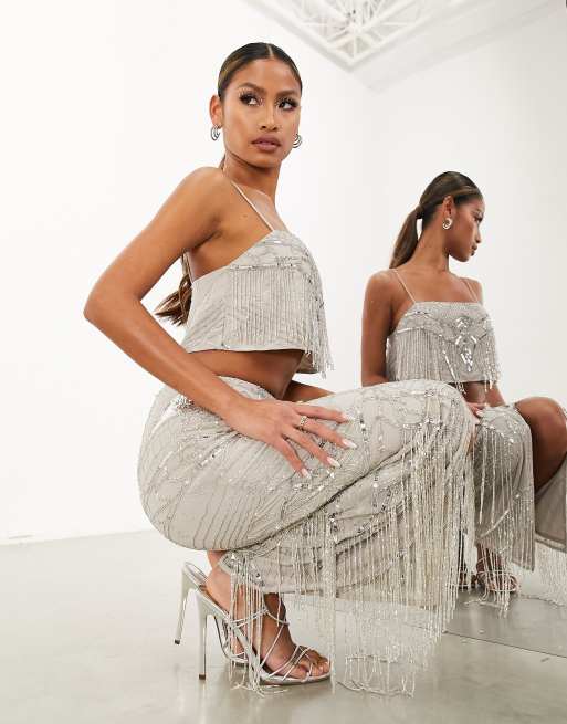 ASOS EDITION sequin and fringe artwork midi skirt in pale grey ASOS
