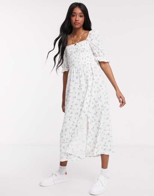 Ditsy Shirred Midi Dress with Sustainable Cotton Blue Midi