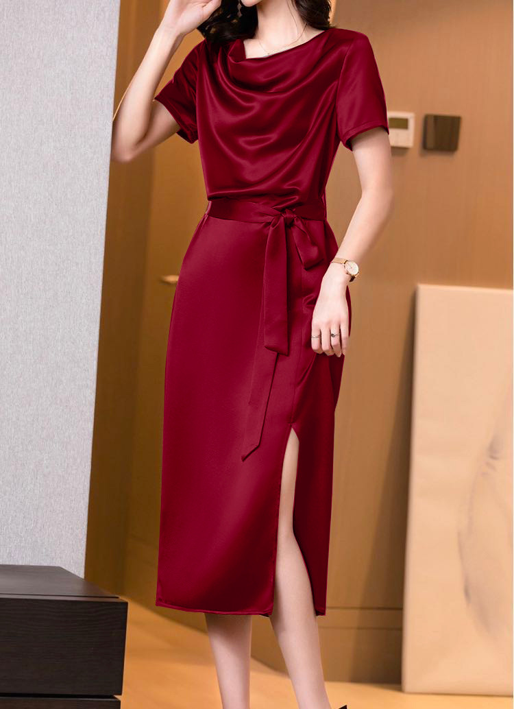 High Grade Acetic Silk Satin Dress short Sleeve Prom Dress side