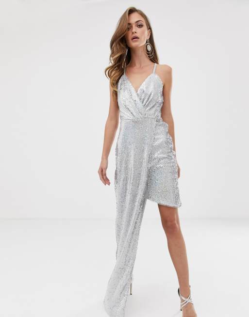 TFNC super mini dress with asymmetric hem in silver iridescent ASOS