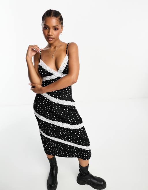 The Frolic lace insert polka dot cami dress in black