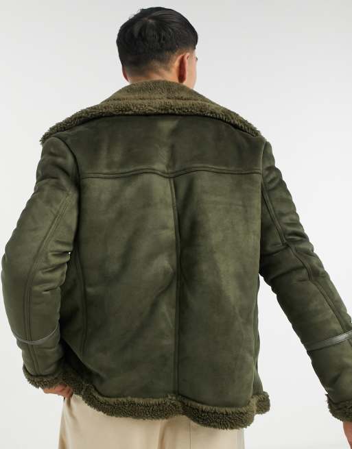 Tan overdyed faux shearling biker jacket clearance, Sixth June faux fur lined aviator jacket in khaki ASOS clearance