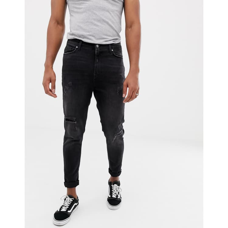 Bershka tapered carrot fit jeans in black with rips and hem taping
