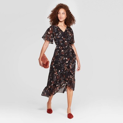 NWT RIXO for Target Black Floral Off the Shoulder Puff Sleeve Midi