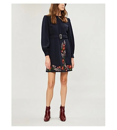 Ted Baker Dress Siliia Kirstenbosch Navy Embroidered Wrap Long Sleeves 2 US 6 S