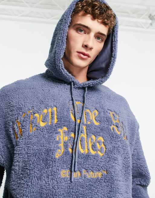 ASOS Dark Future oversized hoodie in teddy borg with gothic slogan embroidery in slate blue