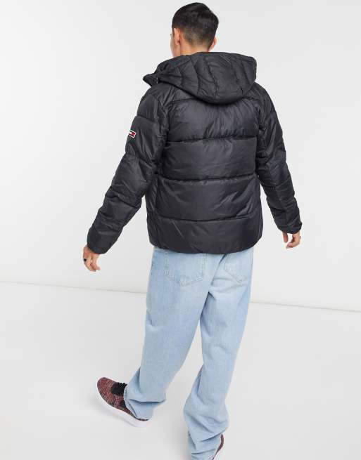 Tommy Jeans essential hooded puffer jacket in black with large flag logo
