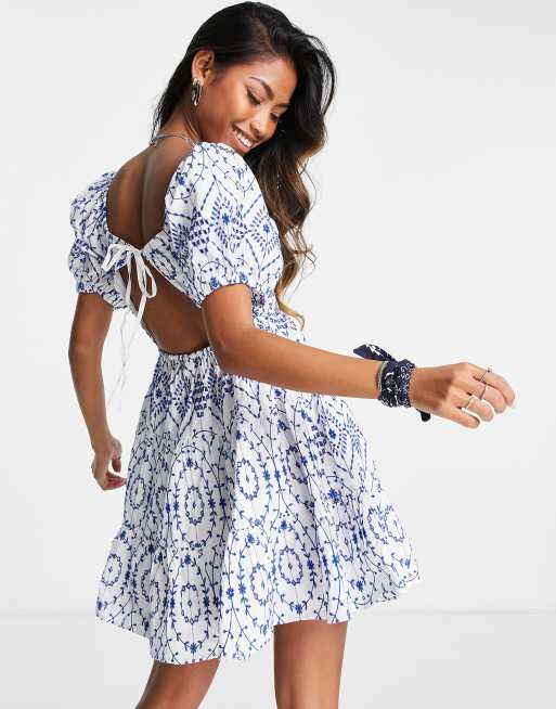 Topshop open back broderie mini dress with blue stitch in white ASOS