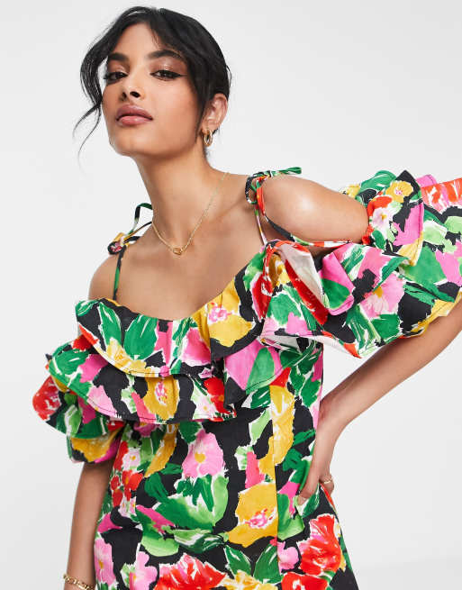Topshop ruffle bardot dress with tie shoulder in multi floral ASOS