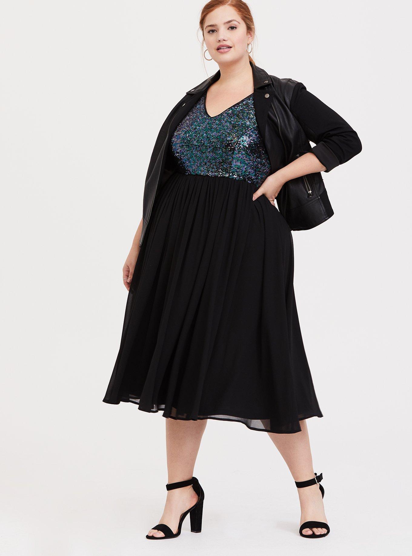 Plus Size Black Sequin Chiffon Skater Midi Dress Torrid