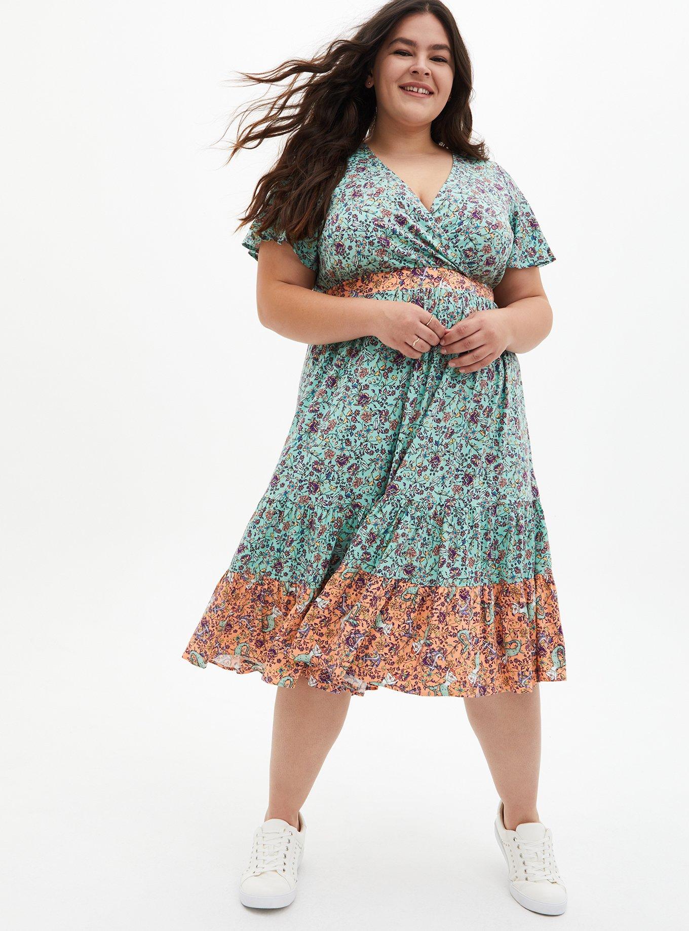 Torrid green floral dress clearance, Plus Size Jade Green Floral Stretch Challis Surplice Skater Midi clearance
