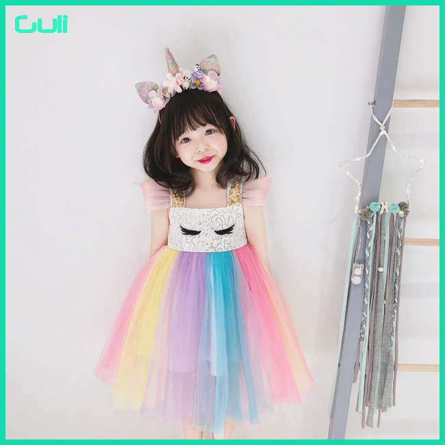Unicorn dress for 7 year old clearance, GULI Girls Suspender Dress Cartoon Unicorn Rainbow Mesh Tutu clearance