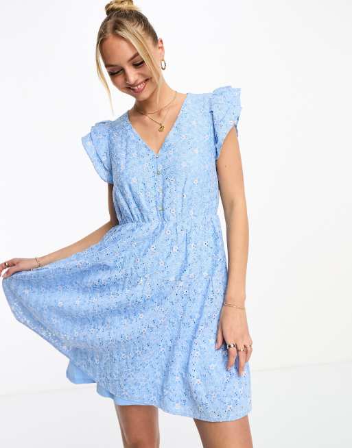 Vero Moda broderie ruffle sleeve mini dress in blue