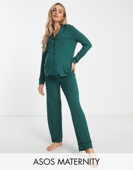ASOS DESIGN Maternity Ensemble de pyjama avec chemise manches longues et pantalon liser contrastant Vert