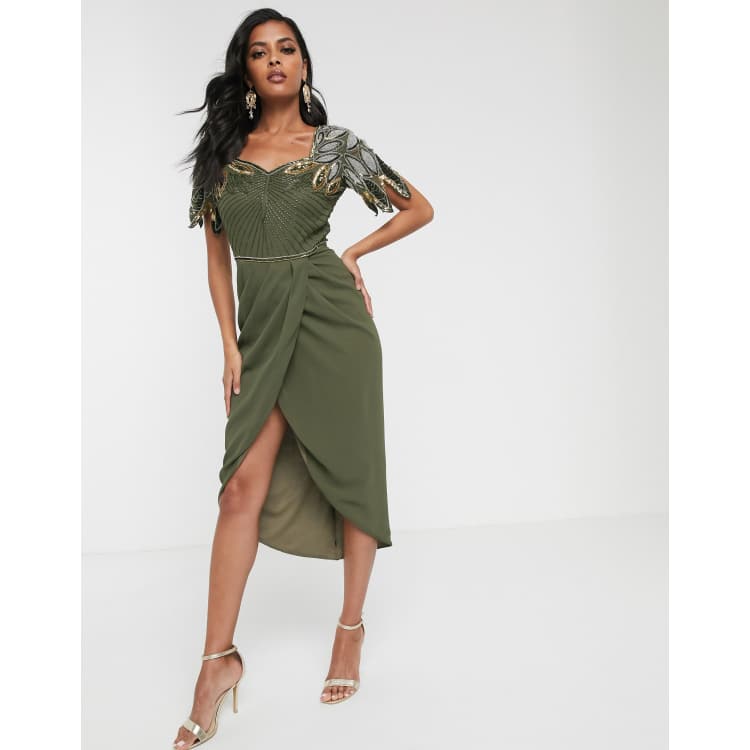 Virgos lounge green dress clearance, Virgos Lounge drape front midi dress with shoulder detail in khaki clearance