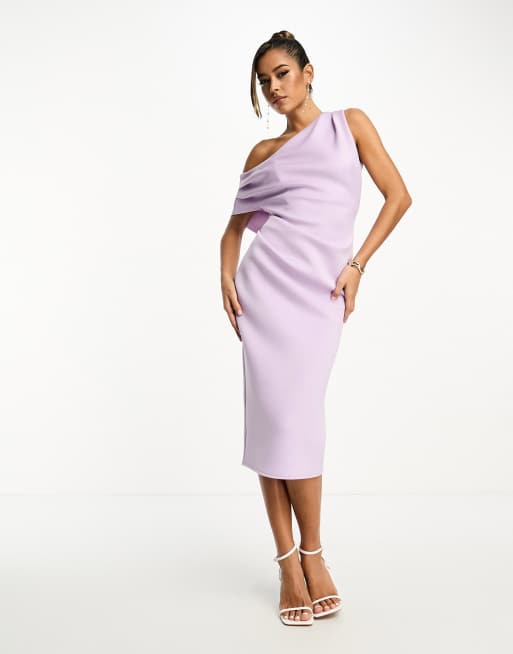 Asos design fallen shoulder prom dress clearance, ASOS DESIGN fallen shoulder pleat back midi scuba dress in lilac clearance