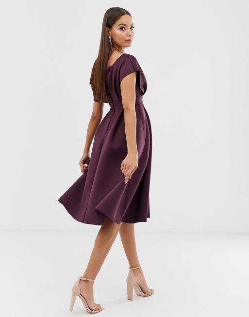 ASOS DESIGN fallen shoulder midi prom dress with tie detail in aubergine