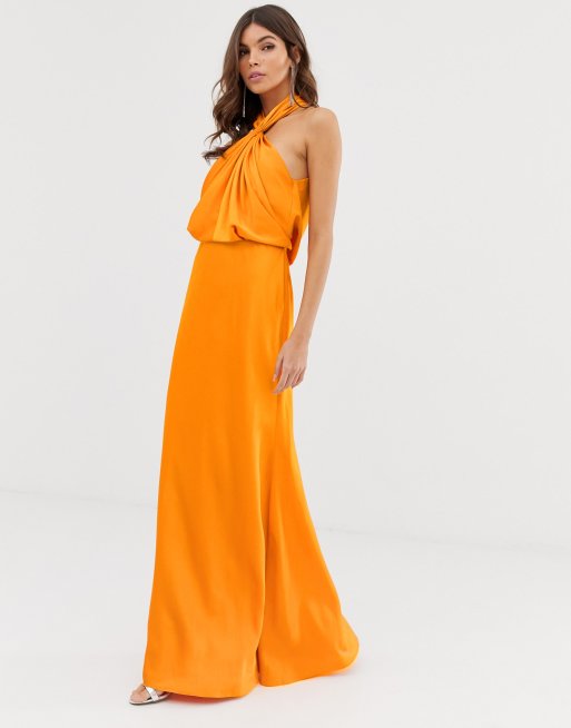 Asos edition ruched halter neck maxi wedding dress clearance, ASOS DESIGN Bridesmaid satin ruched halter neck maxi dress in lemon clearance