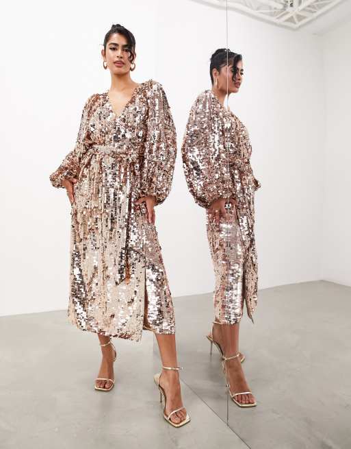 ASOS EDITION batwing sleeve sequin wrap midi dress in gold