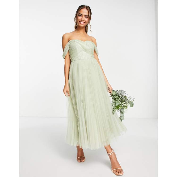 ASOS DESIGN Bridesmaid off shoulder tulle midi dress with tie back and pleated skirt in Sage