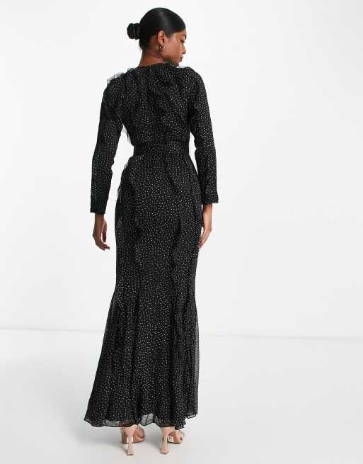 ASOS DESIGN long sleeve ruffle detail maxi dress in black based mono spot