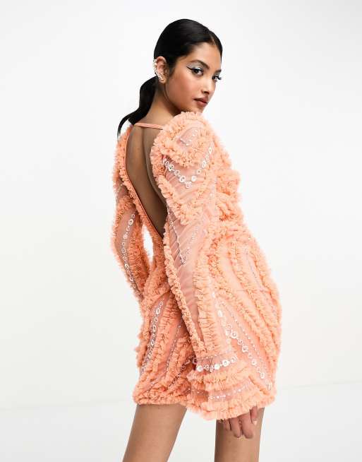 ASOS DESIGN flared sleeve embellished sequin ruffle mini dress in apricot
