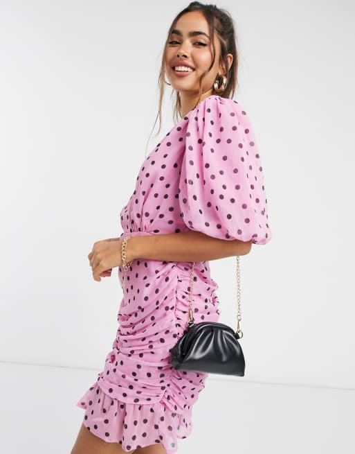 ASOS DESIGN wrap front ruched bodycon mini dress with puff sleeves in polka dot
