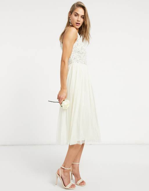 Asos tonal tulle midi dress with embellished cami straps clearance, Maya Bridal halter neck midi tulle dress with tonal delicate sequin in ecru clearance