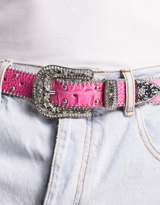 Asos western belt clearance, ASOS DESIGN faux leather western belt with studding and crystals in hot pink clearance