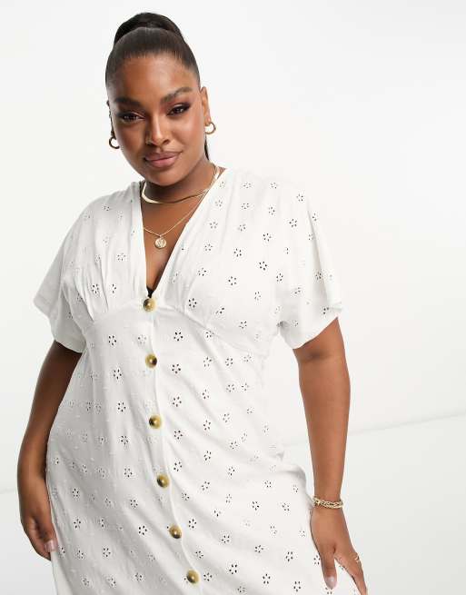 ASOS DESIGN Curve broderie v neck midi dress with buttons in white
