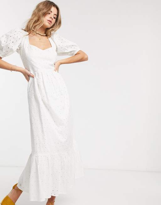 ASOS DESIGN eyelet tiered maxi dress with puff sleeves and open back in white
