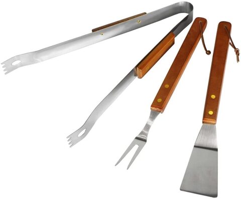 3 Piece BBQ Tool Set Stainless Steel Wood